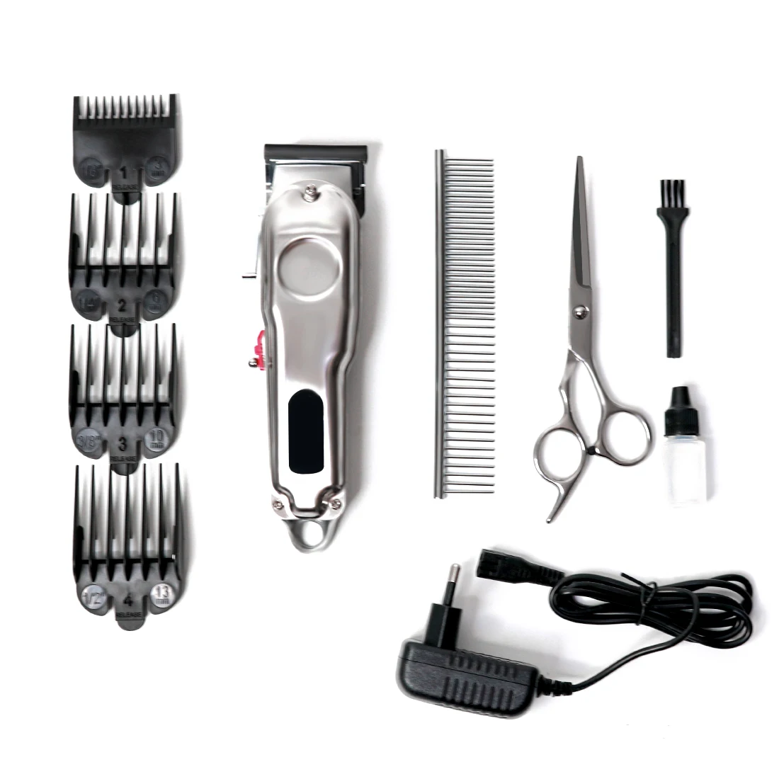 Professional low-noise electric pet hair clipper with durable metal body and safety blades. Powerful, stable, and customizable—ideal for wholesale supply, bulk orders, and private-label pet grooming brands.