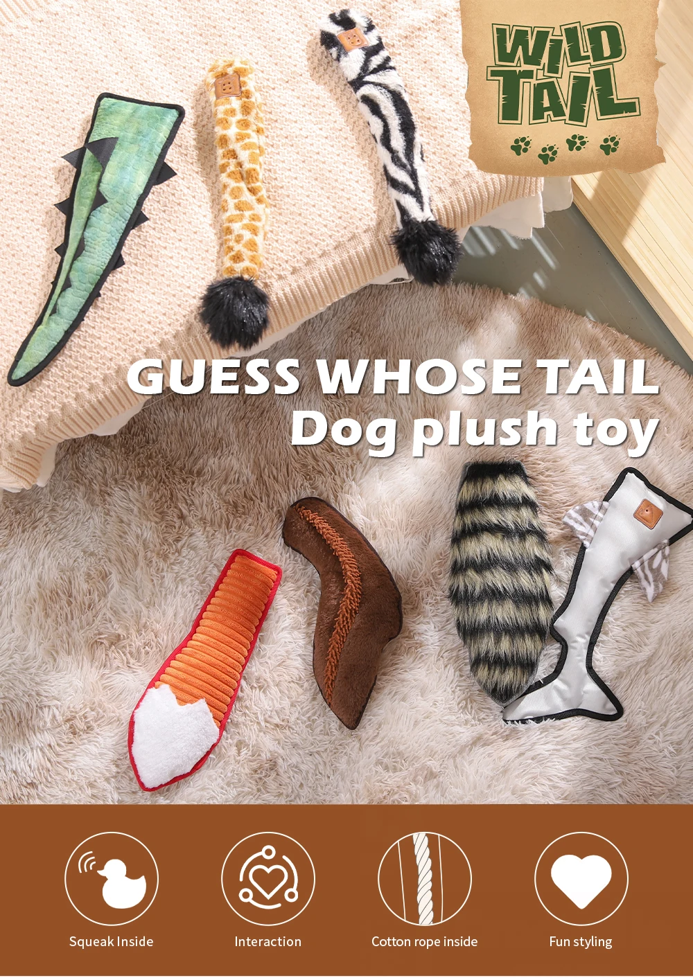 Interactive animal tail–shaped dog toys with squeaker and crinkle sound—perfect for chewing, tugging, and enrichment play. Hot-selling design ideal for wholesale and private labeling.