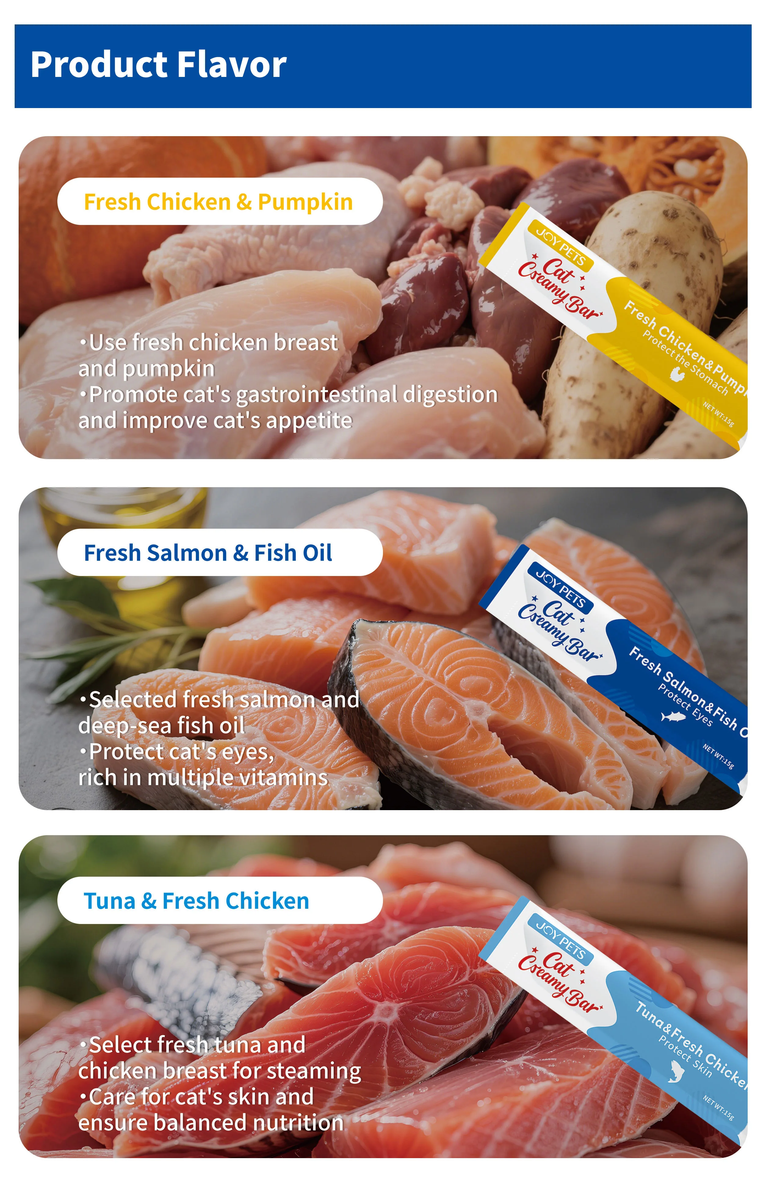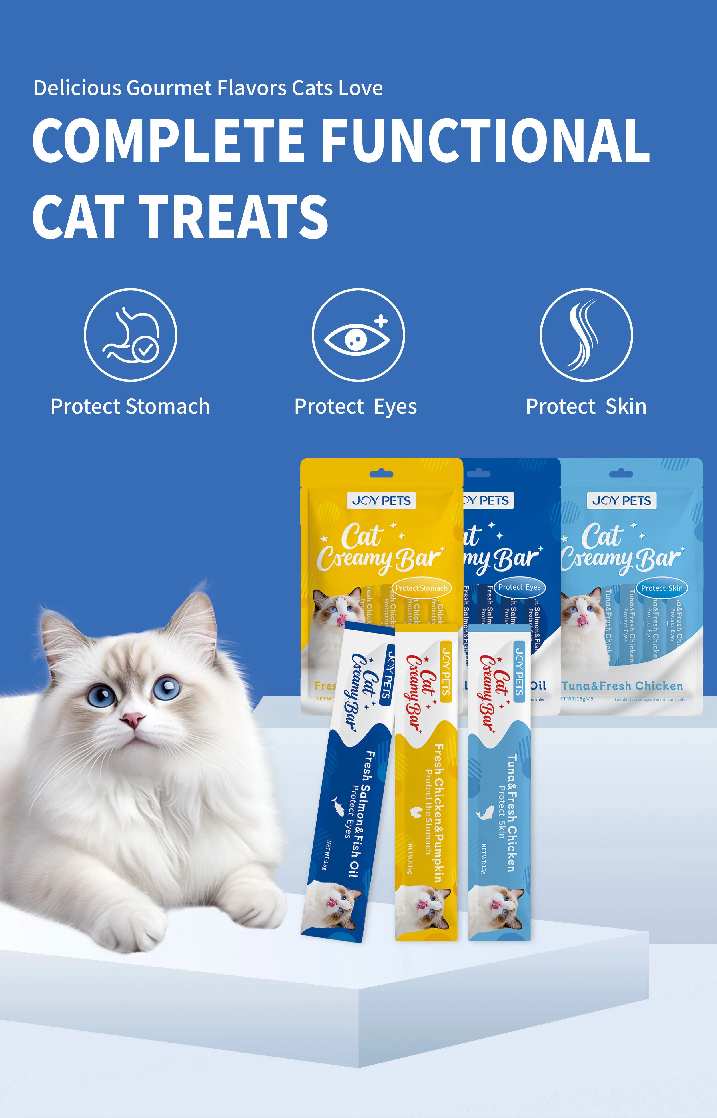 Each 15g pack is designed for easy feeding and portion control, making it ideal for daily rewards, topping dry food, or bonding moments. Manufactured under strict quality and food safety standards, this product offers consistent quality and long shelf life. OEM & private-label customization is available, including custom flavors, functional formulations, and branded packaging—perfect for cat treat brands, wholesalers, and bulk suppliers.
