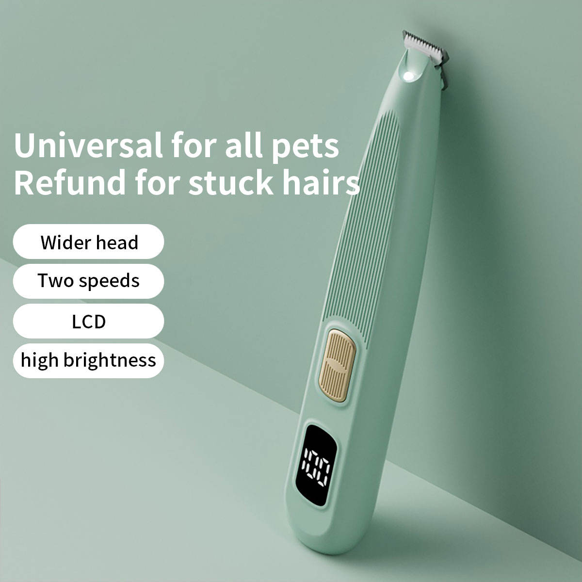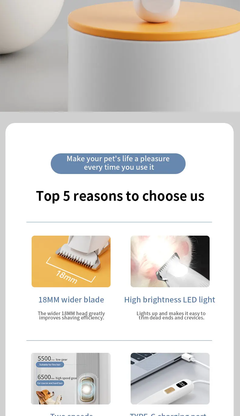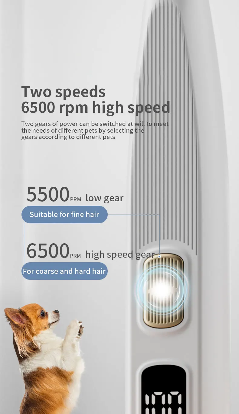 Low-noise cordless pet grooming clippers with rechargeable battery and LED light for precise trimming. Portable, safe, and customizable—ideal for wholesale supply, bulk orders, and private-label pet grooming brands.